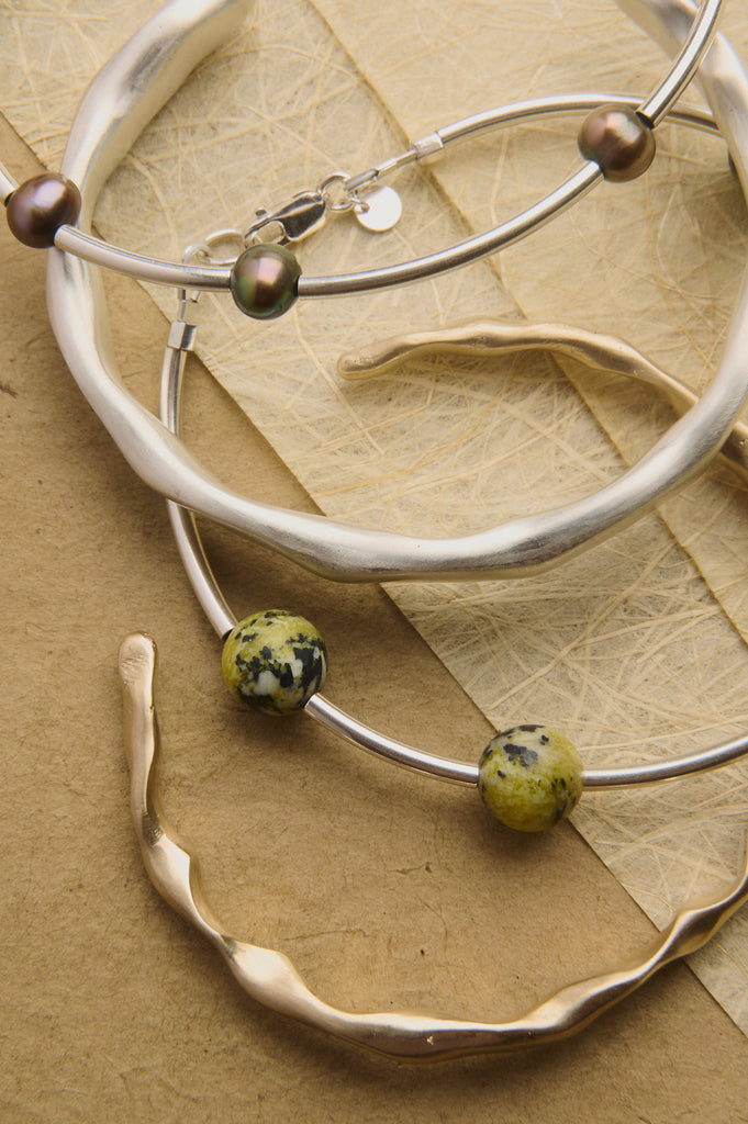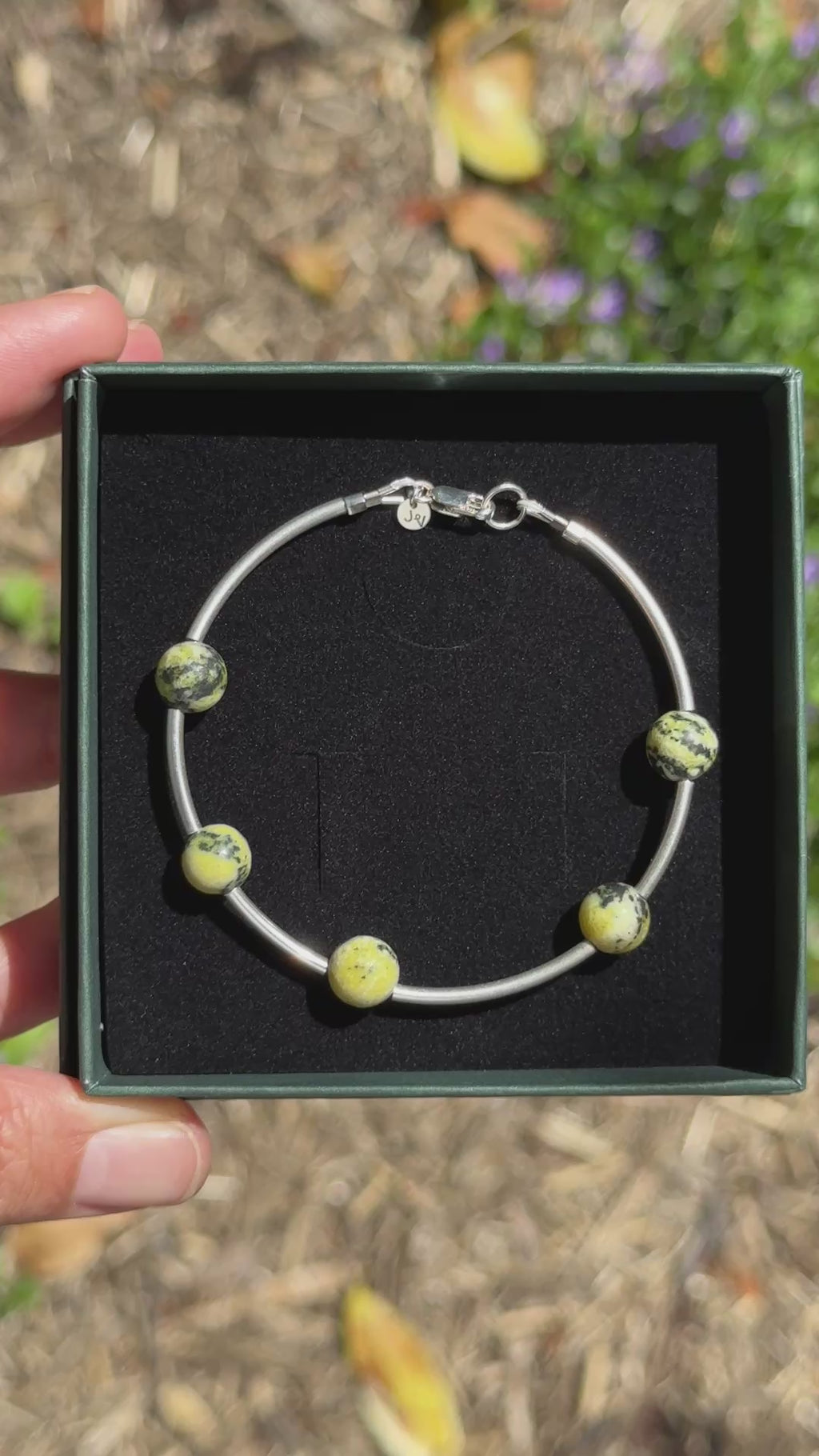 Elongated Silver tube beads are hand strung on silk-like wire with a scattering of African Green Turquoise, sourced from my recent trip to California.