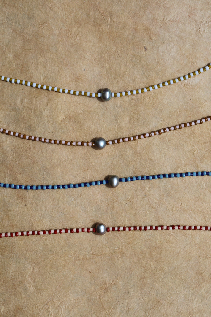 Hand-threaded Japanese glass beads with a luminous silver/grey Freshwater Pearl at the centre. Finished with a 14k Gold Fill or 925 Sterling Silver lobster clasp.