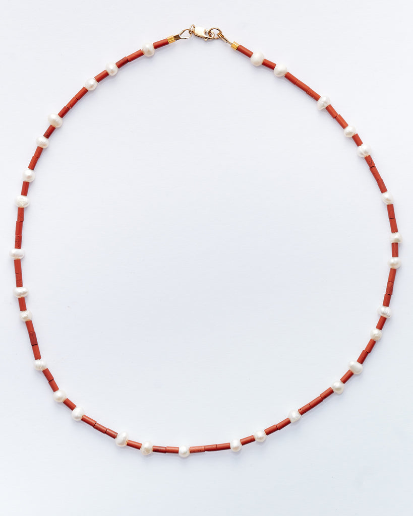 Cylindrical red Jasper beads are strung between pops of Freshwater Pearls, finished with a 14k Gold Fill lobster clasp.