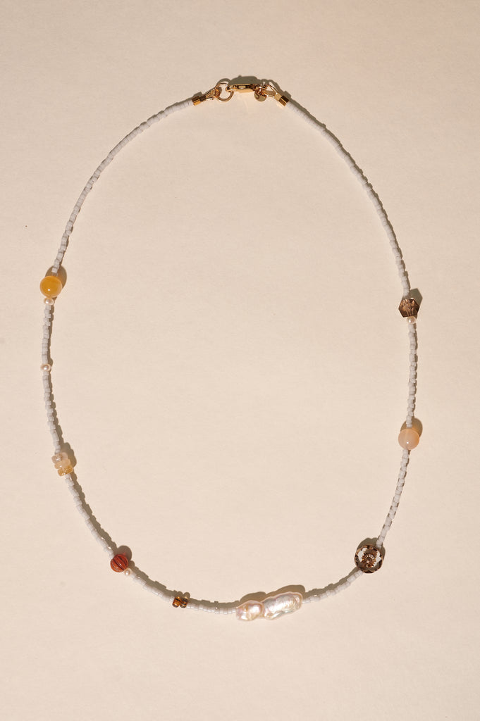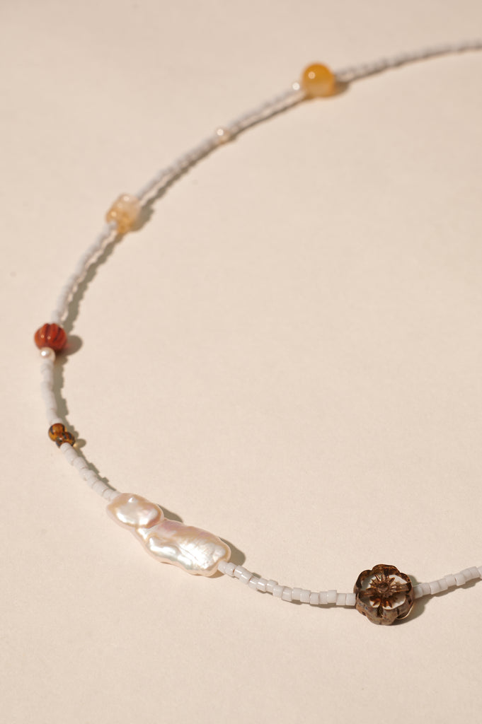 Keshi & Freshwater Pearls, Montana Moss Agate, Smokey Quartz, Rutilated Quartz & hand-painted glass beads are threaded on silk-like wire with the softest blue Japanese glass seed beads, finished with a 14k Gold Fill / 925 Sterling Silver lobster clasp.