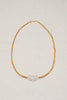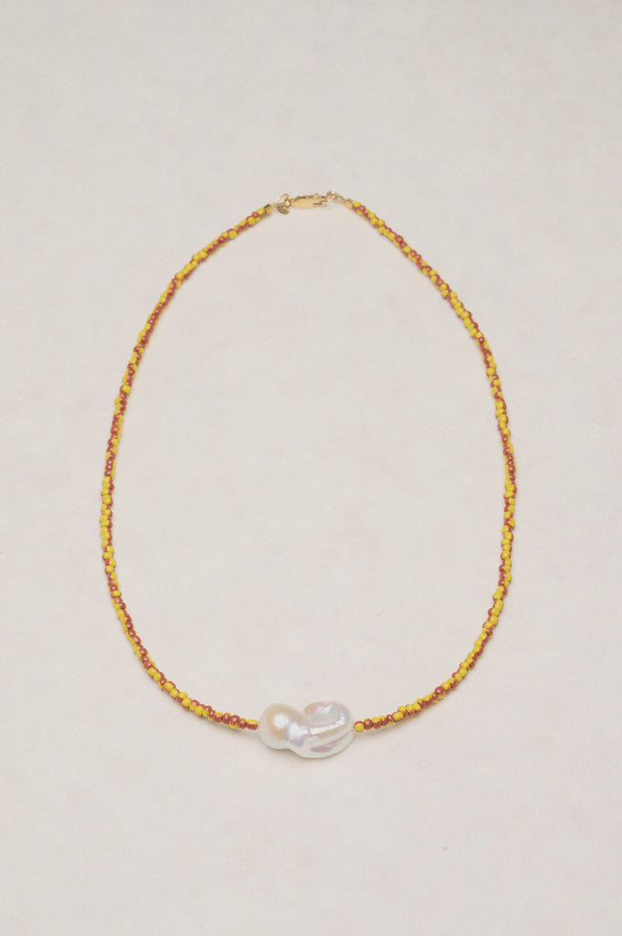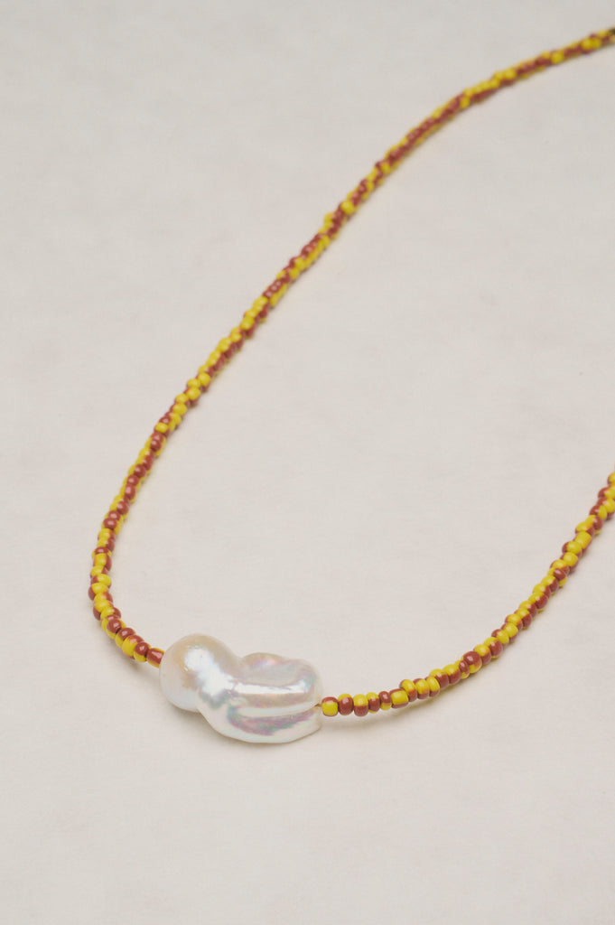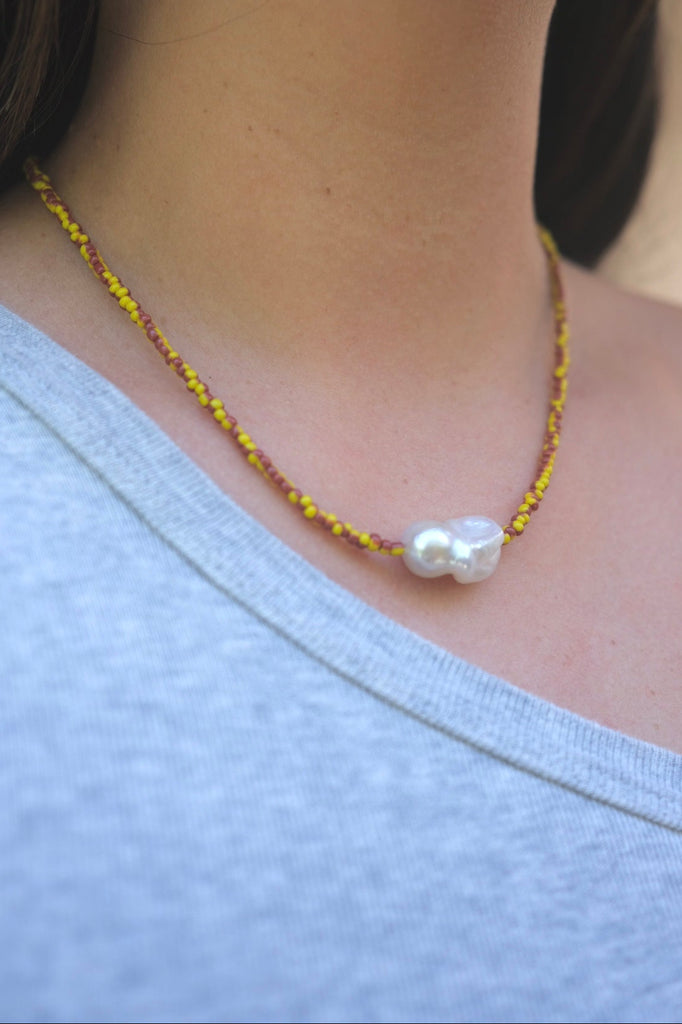 A chunky & luminous Baroque Freshwater Pearl, threaded with striped glass beads, strung on silk-like wire and finished with a 14k Gold Fill or 925 Sterling Silver lobster clasp.
