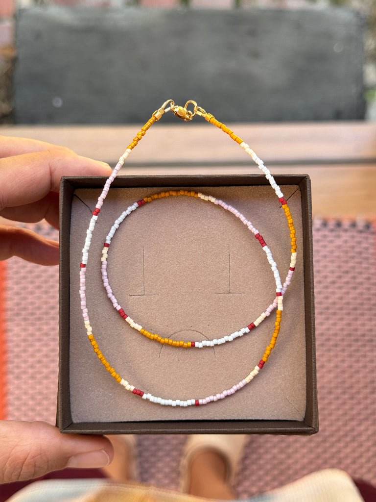 Teeny Japanese glass beads strung on silk-like wire, finished with a 14k Gold Fill lobster clasp